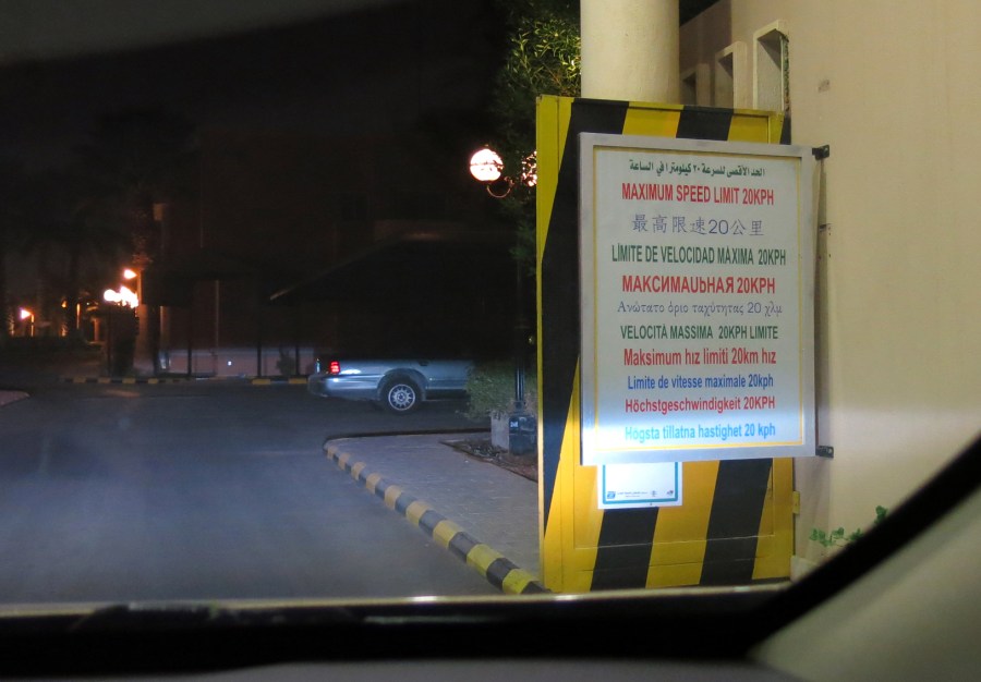 På väg in genom sista grinden. Fartbegränsning på många språk. T.o.m. svenska!