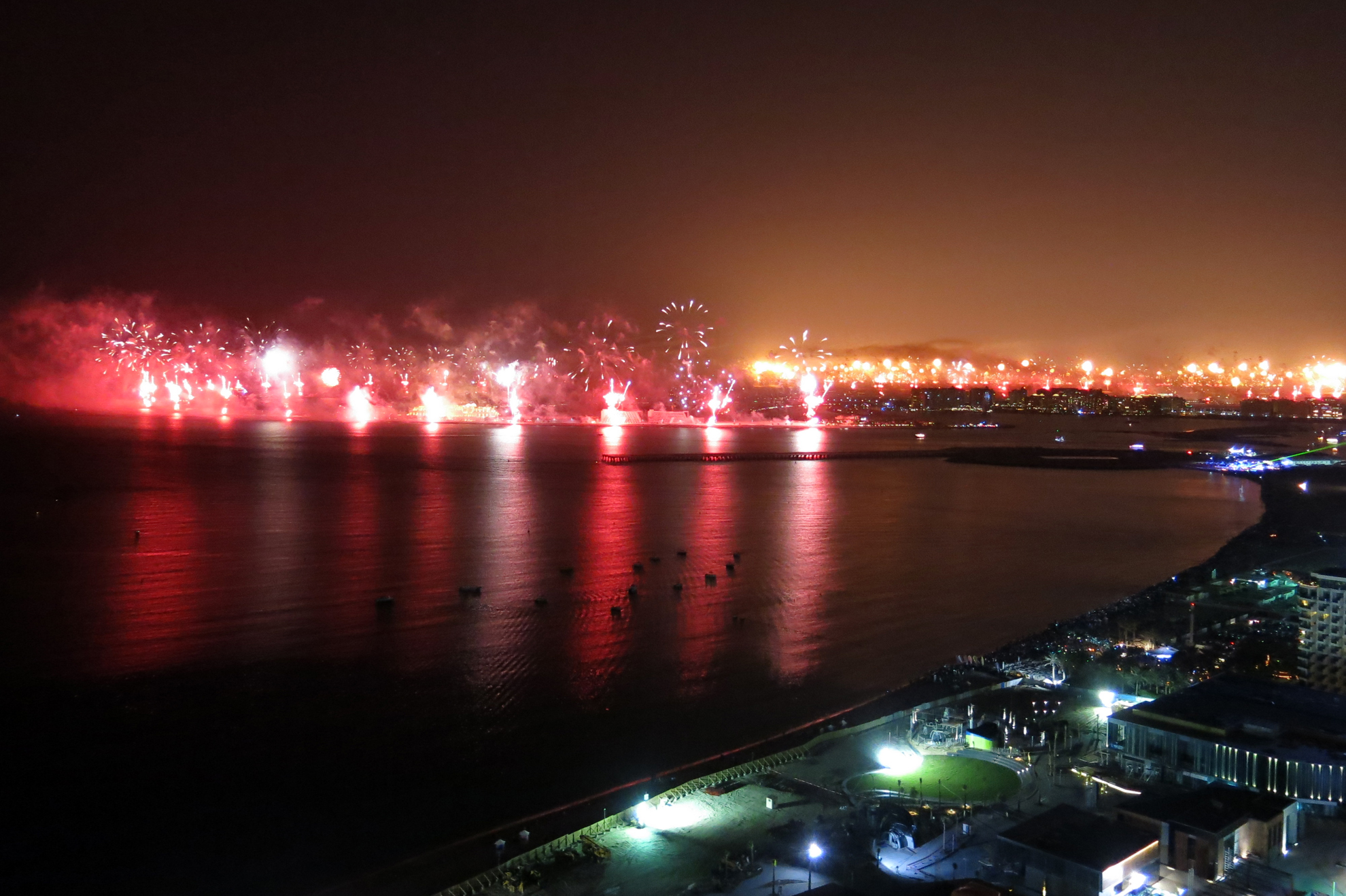 För – alltså otroligt nog var det först när vi hade bokat (vilket vi gjorde någon gång i slutet av oktober) som vi hörde talas om världsrekordet i fyrverkeri… Som skulle iscensättas från the Palm… Som vi nu tittade ut över, från vår balkong på 29:e våningen…