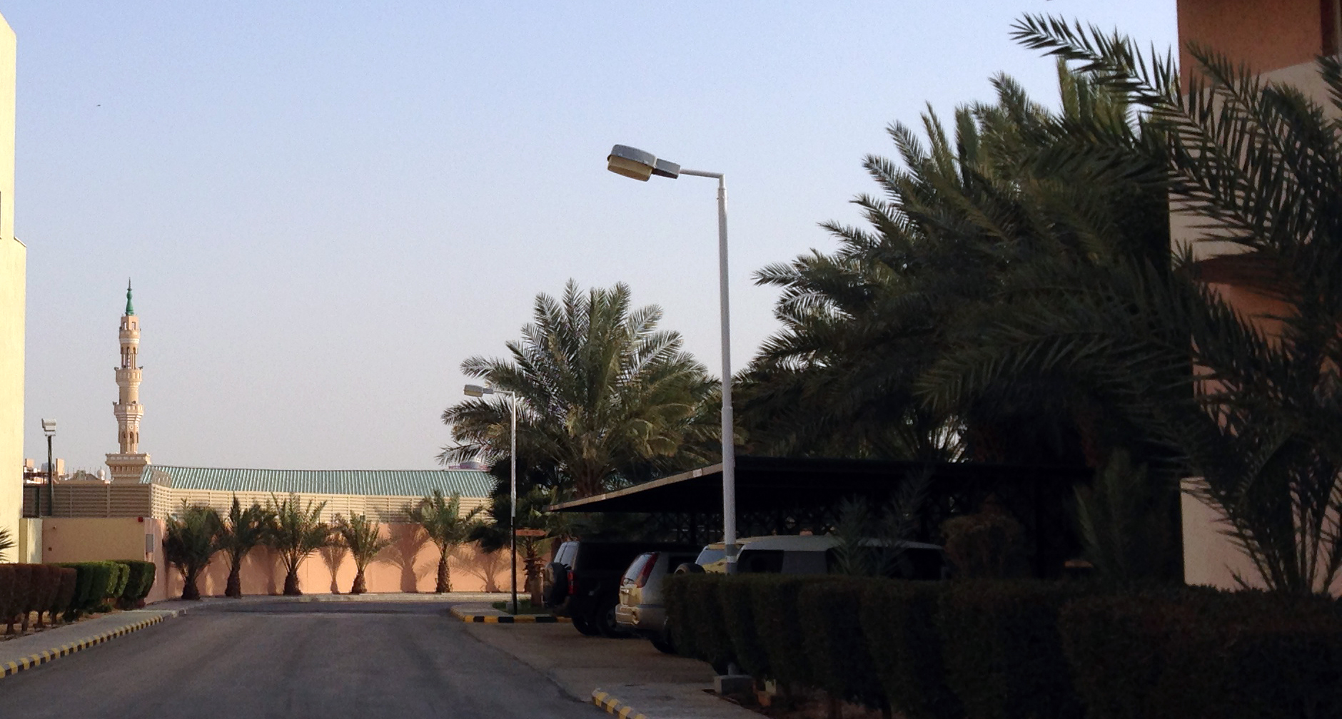Del av compound-muren och den skönsjungande minareten därutanför.