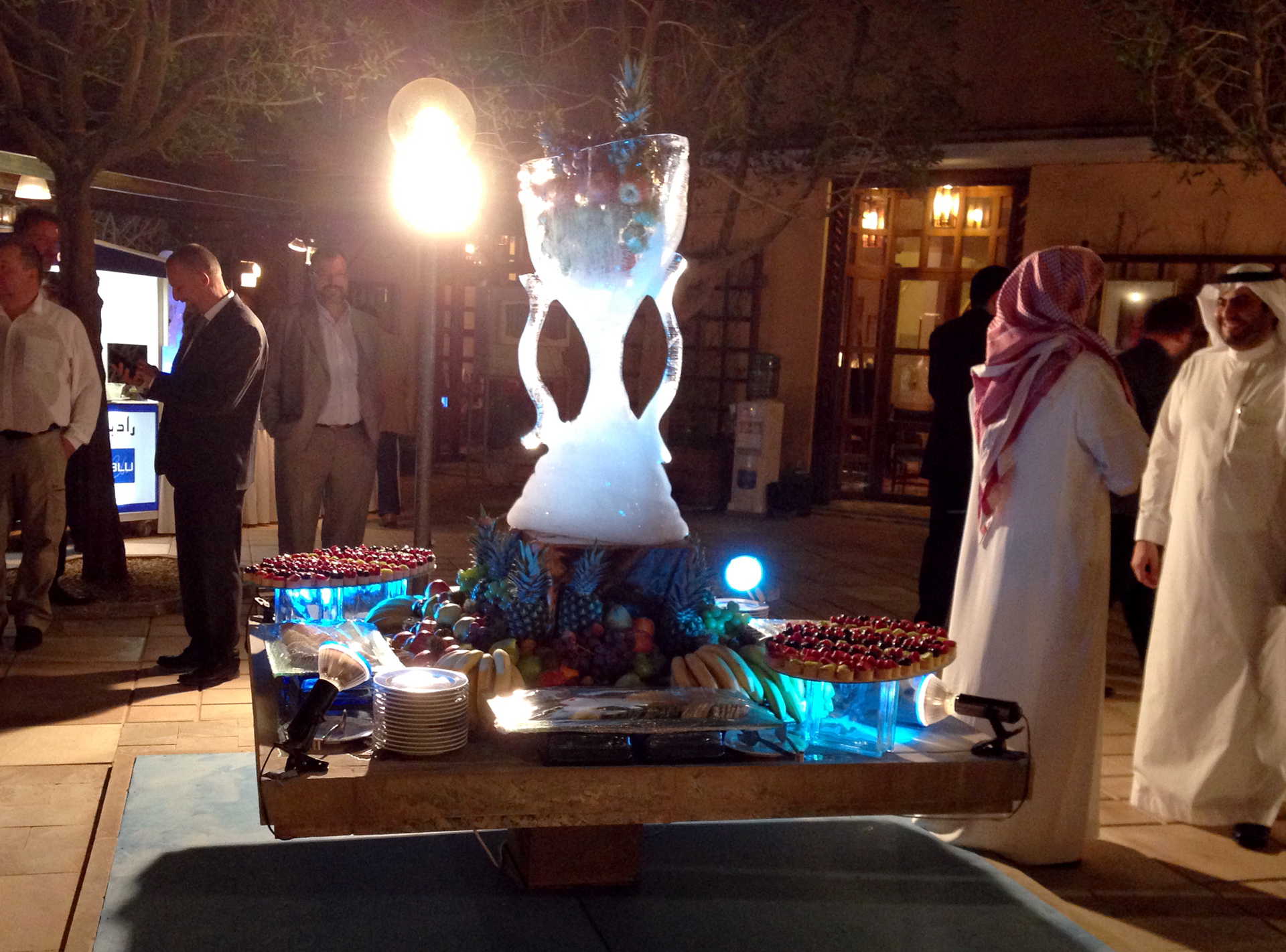 Från ingången minglade vi in genom en allé av roll-ups för svenska företag, ljusslingade träd och belysta buskar, och kom in på en gård med ett himmelrike av läckerheter runt väggarna. Sushi, olika sorters lax, sillbord, grönsaker att dippa… och mitt på golvet tronade en isstaty. Här kanske jag borde inflika att det var 39 grader varmt ute. ”Vilken tur att det inte är så hett ikväll,” som vi härdade ökenbor uttryckte saken. Men en isstaty…!! Dom måste väl ha något slags osynligt frysaggregat inuti, eller?
