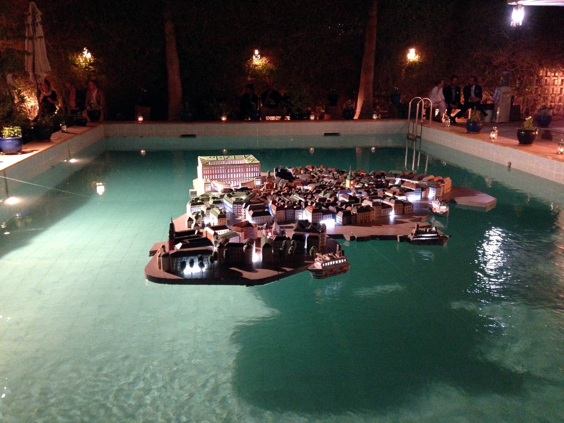 Denna kväll var alla trädgårdar kantade av dignande bufféer, med allt man kan tänka sig, från smörgåstårta (jättegod) till svenska köttbullar (jättegoda). En av trädgårdarna hade en upplyst swimmingpool och mitt i den flöt Gamla Stan omkring… En detaljrik modell som till och med hade gatubelysning! Och i det lilla lilla Stockholms Slott måste det ha pågått en liten liten bal, för alla fönster lyste som vid fest.