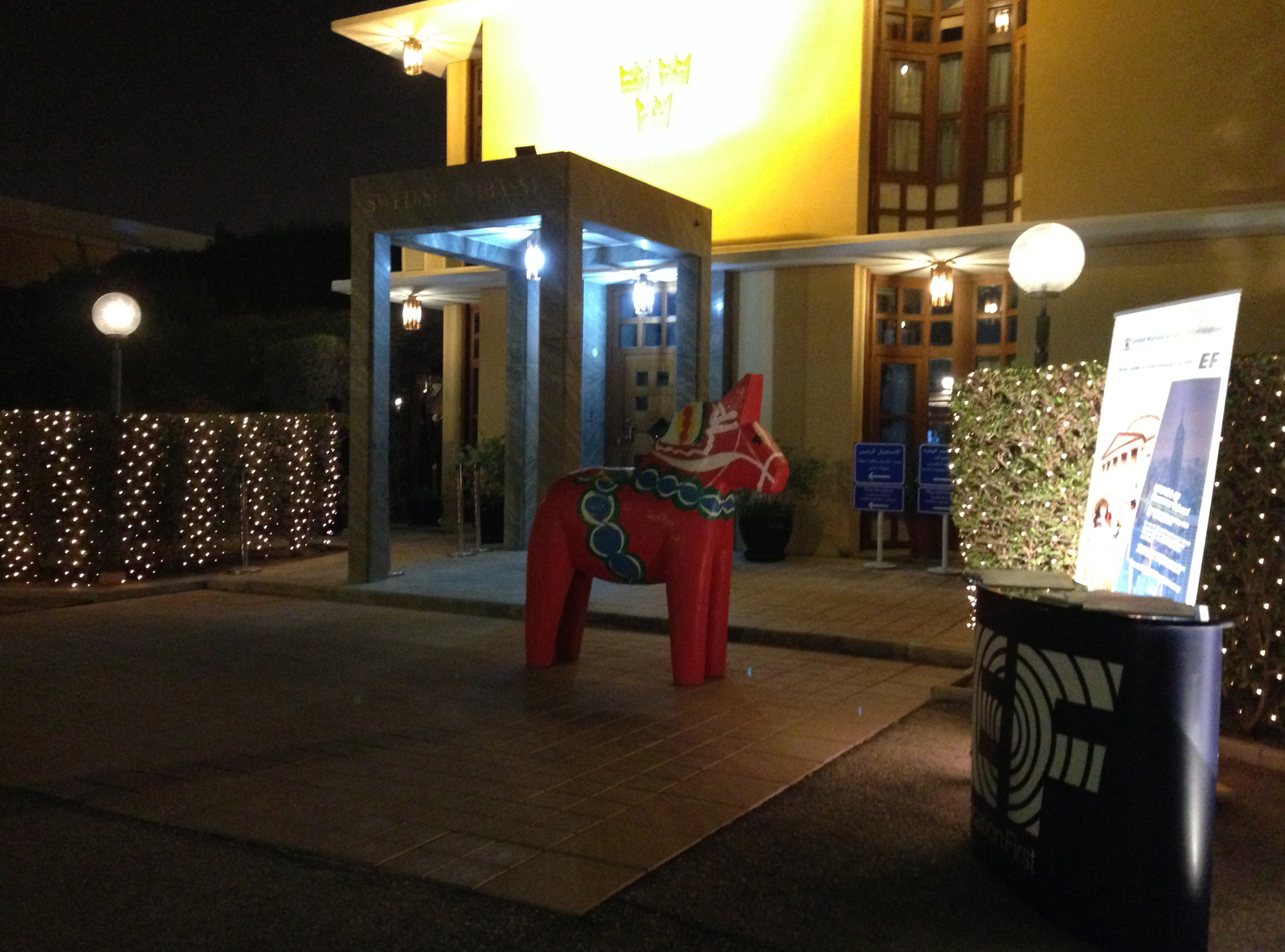 Taxichauffören var uppenbarligen inte helt bekant med adressen, men lyckades leverera oss efter 20 minuters åkande runt, runt, inne i Diplomatic Quarters, DQ, som är ett stort och dåligt skyltat område. På något sätt slutade alla svängar med att vi kom tillbaka till Brittiska ambassadens baksida. Därinne var det fest. På franska ambassaden var det också fest. Men vi skulle till svenska ambassaden, för där var det vår fest.
