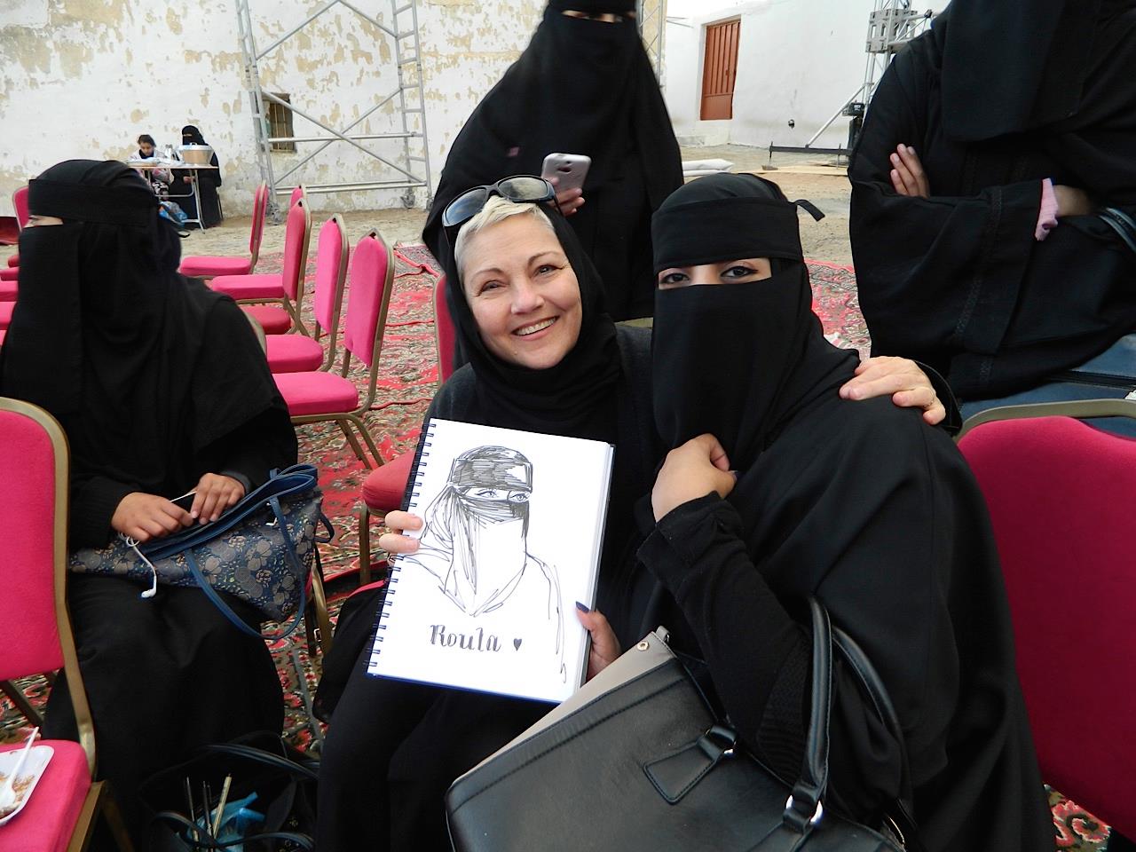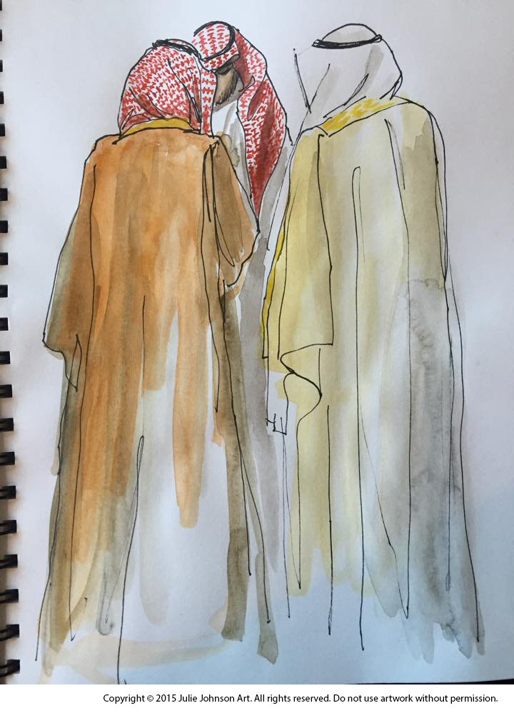 Häromveckan planerade jag att skriva om de saudiska männens klädkoder, och när jag letade efter en lämplig bild till det inlägget, fick jag syn på en urläcker teckning med just män i sina ‘thobes’. Så jag kontaktade illustratören och bad om tillstånd att använda hennes skiss. Det blev upptakten till en helt annan dialog än jag hade väntat mig…