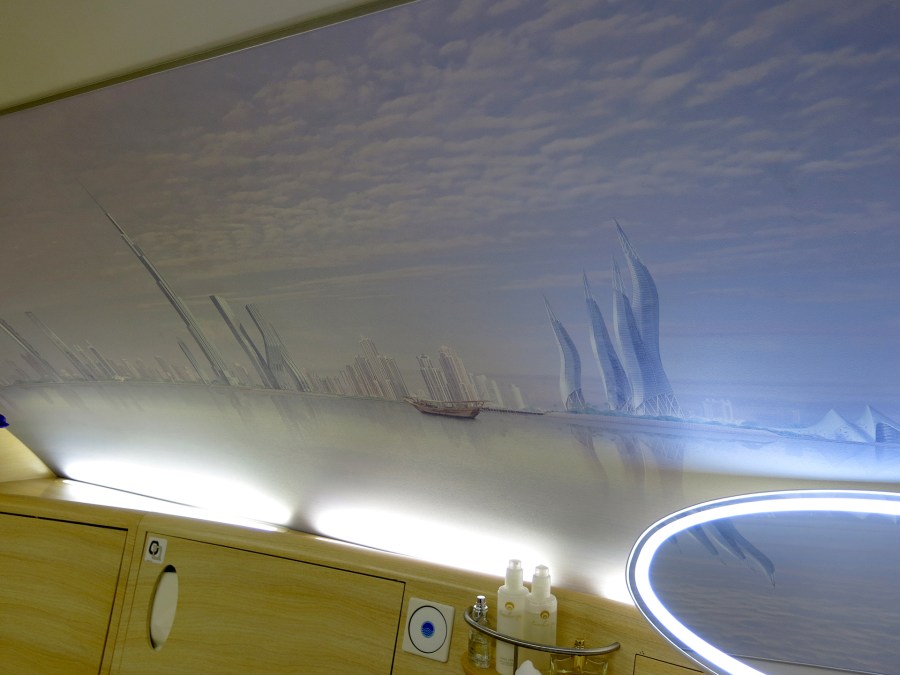 Målning av Dubais skyline prydde ena väggen. Den motsatta var en stor heltäckande spegel.