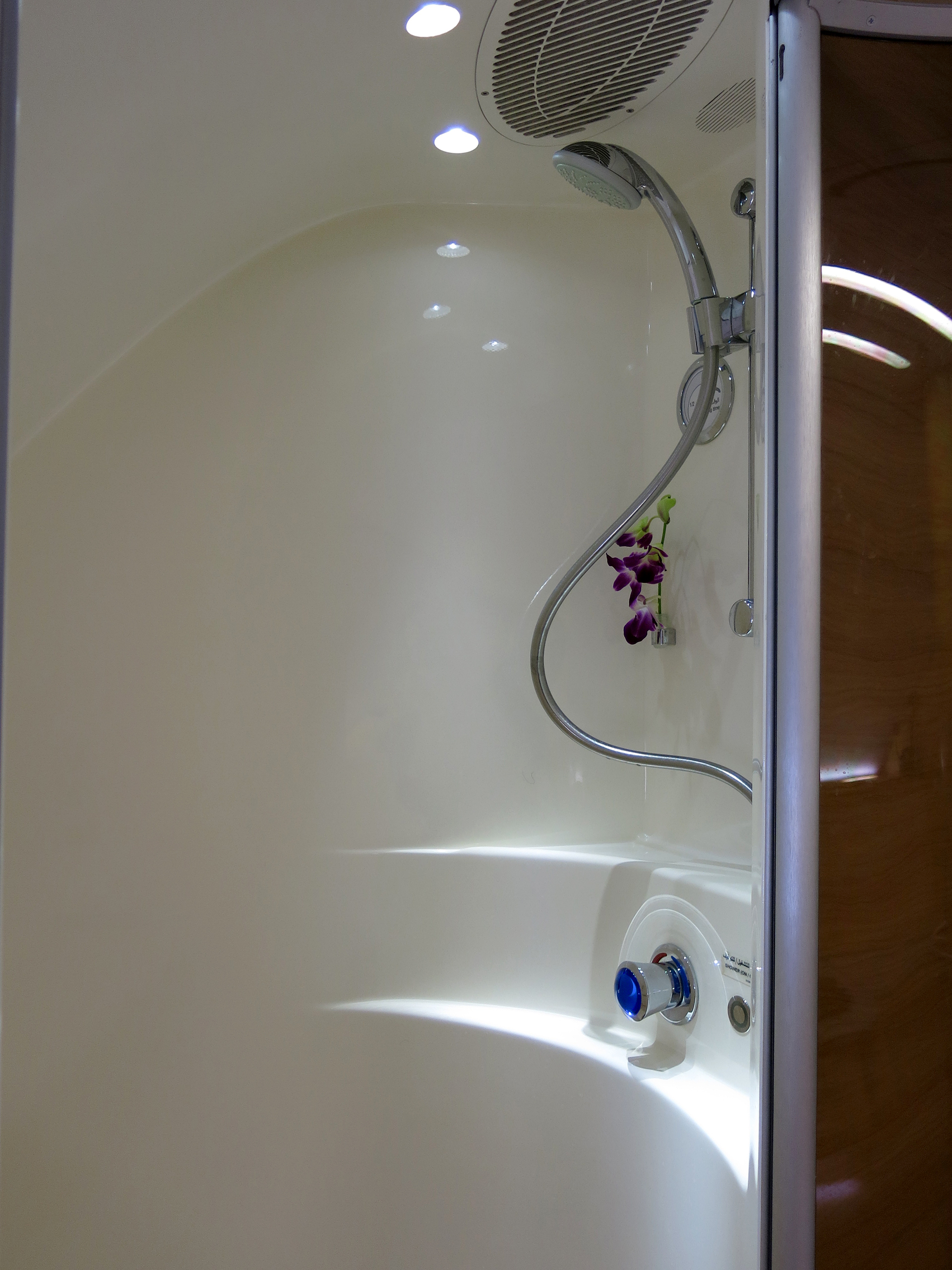 Och så duschen. Man bokar duschtid genom flygvärdinnan vid avfärden. ”Välkomna ombord, önskas en drink? Vill ni duscha?” Fem minuter fick man på sig, sedan stängdes vattnet av.