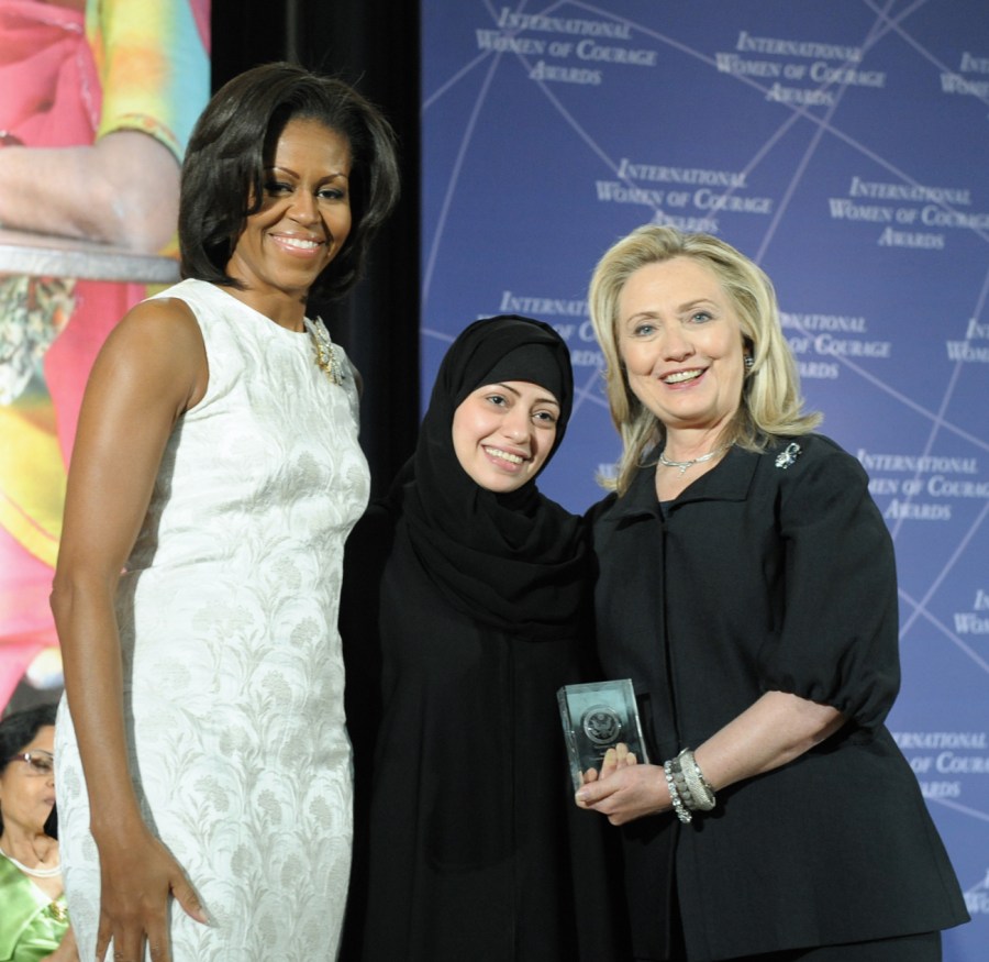 Samar Badawi med Michelle Obama och Hillary Clinton år 2012, i samband med att hon fick ta emot International Women of Courage Award.